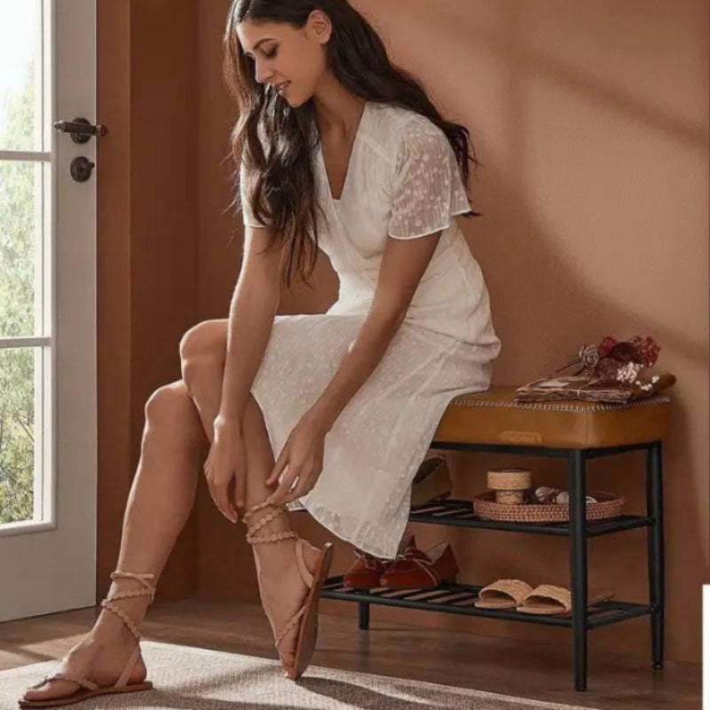 Entryway Storage Shoe Rack with Leather Stitching (Caramel Brown)