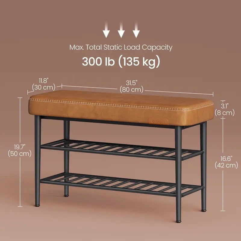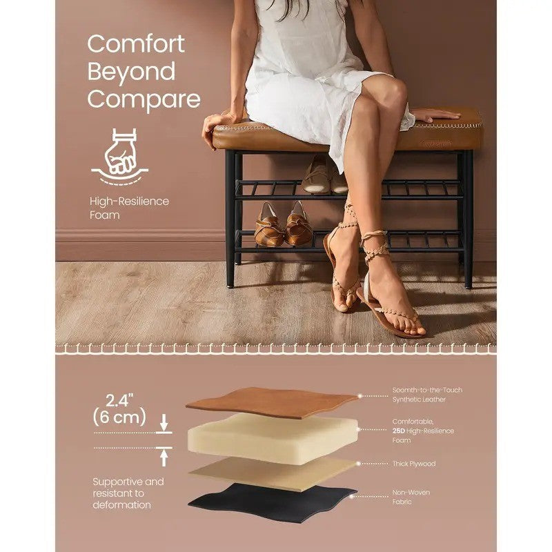 Entryway Storage Shoe Bench | Shoe Rack with Synthetic Leather Stitching (Caramel Brown)