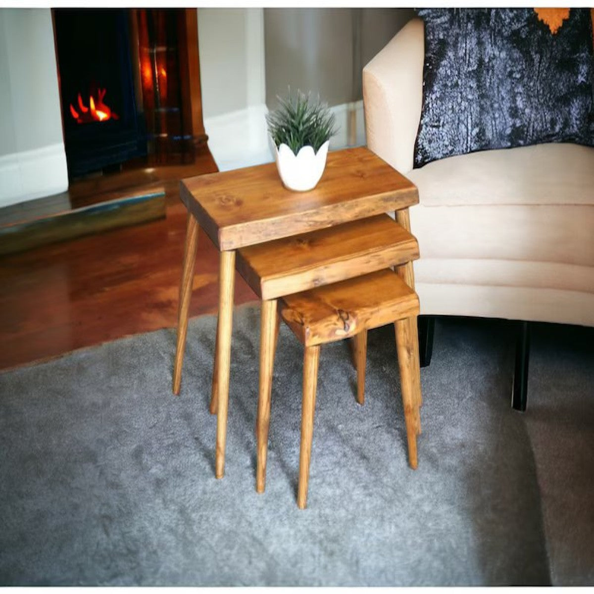 The set includes three distinct sizes, ensuring flexibility and adaptability to suit your space and preferences. The largest table serves as a central coffee table, the medium table functions as a side table or accent surface, and the smallest can be used as an end table, nightstand, or display surface. This range of sizes allows you to configure the tables in multiple ways, catering to your lifestyle and spatial requirements. The 3-Piece Solid Wood Nesting Table set is perfect for small apartments, cozy living rooms, or large family spaces where versatility is key.